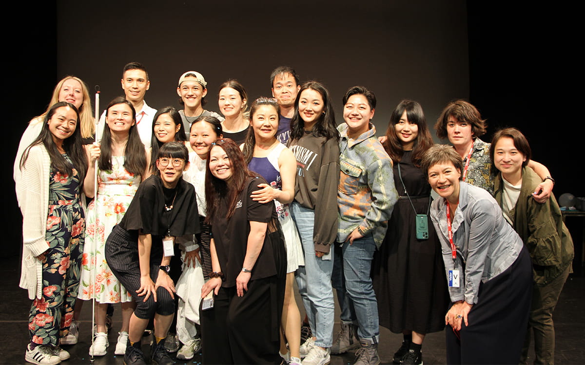 Grace with artists from New Earth Academy 2022, a programme by New Earth Theatre providing free specialist training and performing arts opportunities for BESEA artists in the UK.