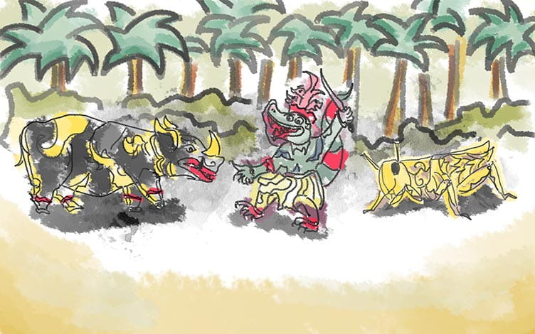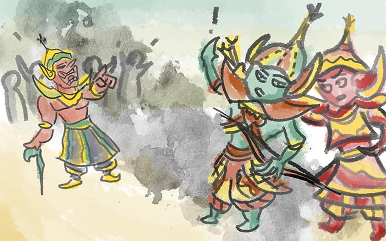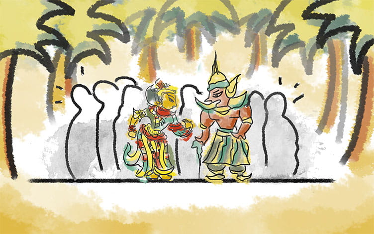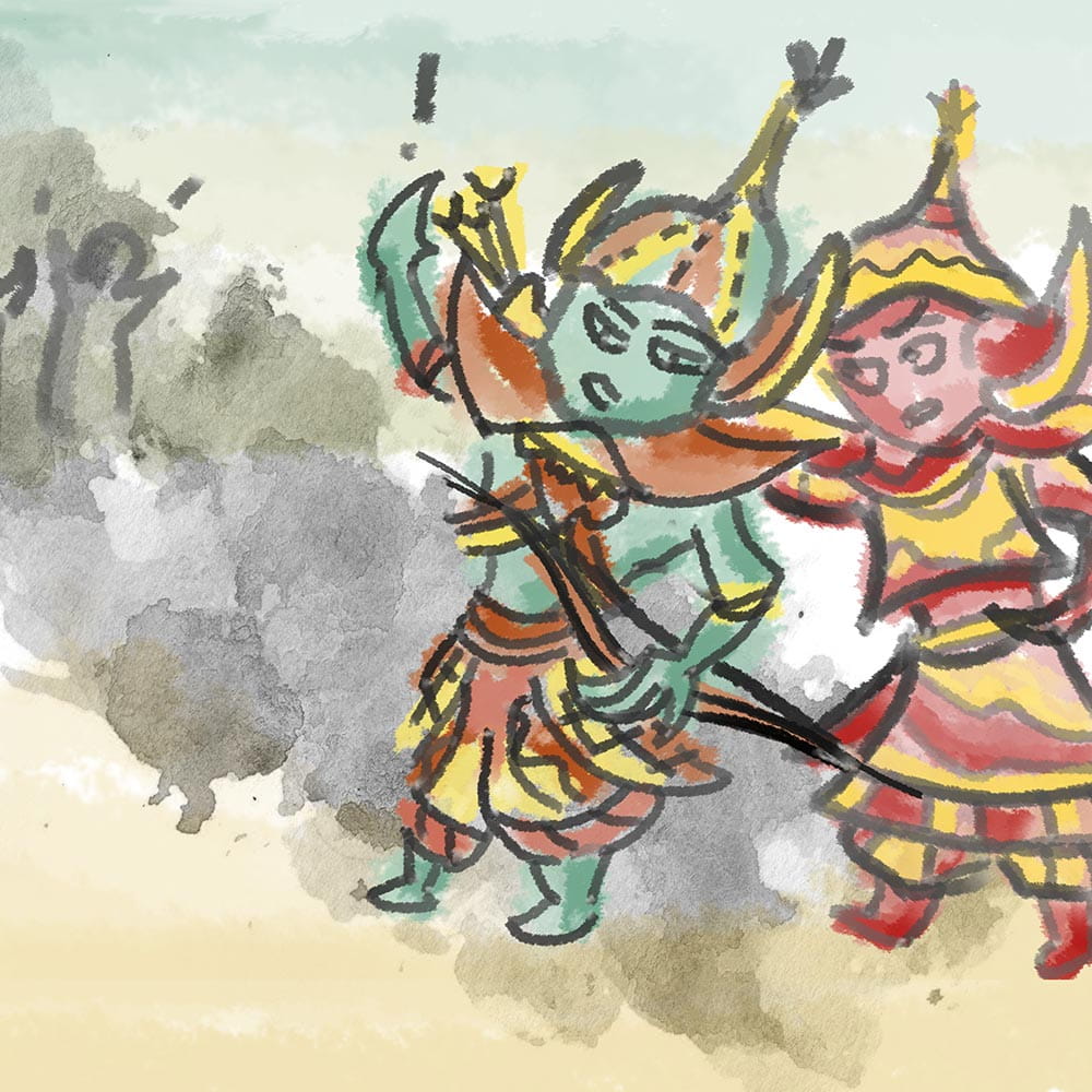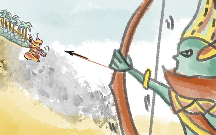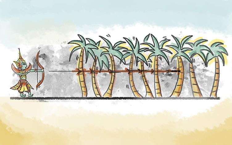 Whoosh! Anak panah itu menembusi satu…dua…tiga…sehingga ke batang pokok yang ketujuh. Kemudian, ia terhenti. Seri Rama telah gagal!
