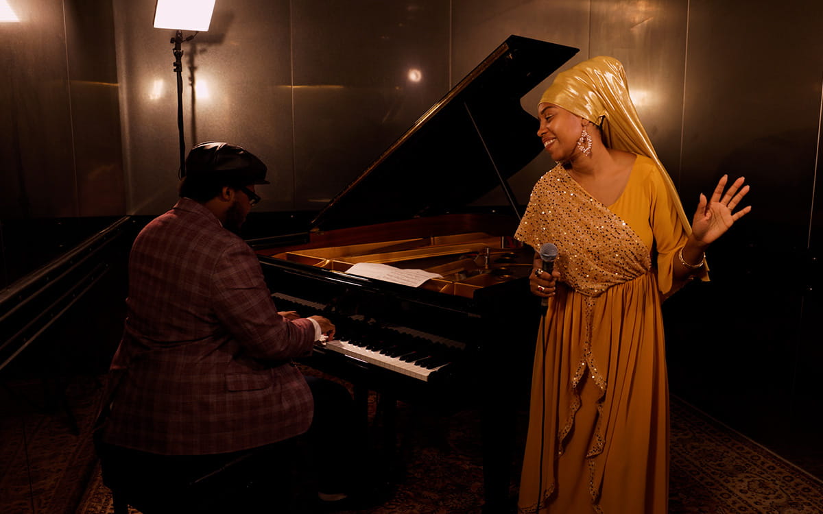Draped in yellow and gold, singer and composer Jazzmeia Horn exuded abundance in pure artistic expression. A modern-day jazz luminary, her star power was on full display when she graced the cargo lift while here for her performance as part of Jazz in July 2024. Alongside pianist and collaborator, William Hill III, this charming duo put on a performance brimming with sincere expression and emotion, showcasing an exceptional rendition of the jazz classic Darn That Dream and an exuberant performance of Tip, a freshly released original by Jazzmeia herself.