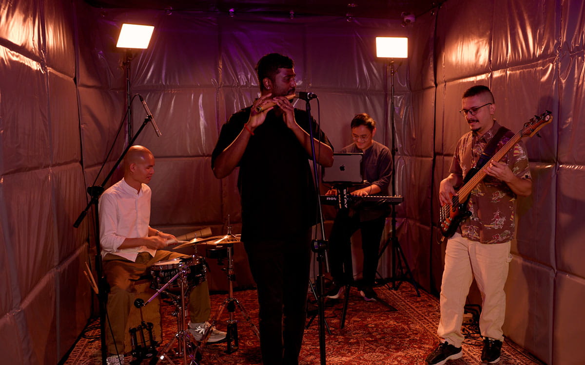 Ragas and riffs, talas and twelve-bar blues. There’s not a group quite like RaghaJazz in Singapore—marrying the melodies, beats and essences of Indian classical music with jazz and funk, this homegrown ensemble consistently presents refreshing contemporary spins on classical ragas. The brainchild of flautist and composer Raghavendran Rajasekaran, RaghaJazz has steadily grown with Esplanade, marking several milestones here including their 15th anniversary in 2024. Prior to their celebratory concert on 22 & 23 Nov as part of Kalaa Utsavam 2024, the core ensemble took to the cargo lift with a new composition, Tidal Streams, as well as one of Ragha’s earliest compositions, Saraswathi.