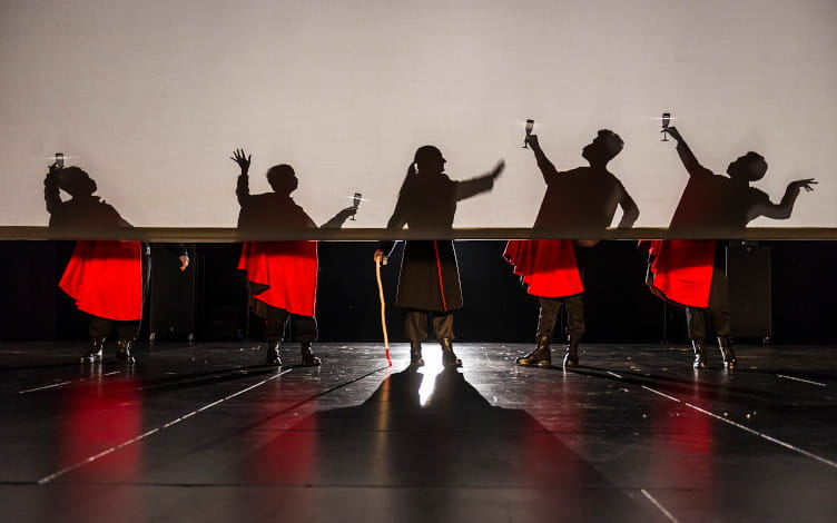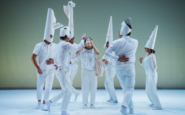 In fact, if there is a culture that has been a particular source of inspiration for Chong, it is certainly Japan’s, as evidenced by his repeated collaborations with the country’s artists. These productions showcase different aspects of Japanese arts and culture, whether it be the meditative tone and predominantly chalk-white palette of Seed (2014), the hyper-designed comic book costumes of Drums, or the ningyoburi performance technique in Oiwa where actors perform onstage as life-sized puppets while other actors, clad in black, pretend to be controlling their movements.