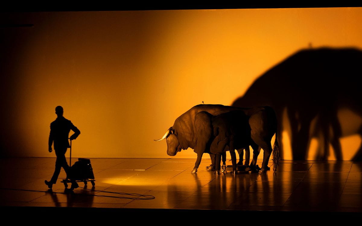 Papaioannou is himself a painter, so within him the director/choreographer’s instincts are combined with the painter’s/artist’s eye. Transverse Orientation began from a strong sense of curiosity. Papaioannou wondered about how to move a life-size puppet of an animal and to move it in a way as if it was moving the performer. The idea of taming of a wild animal gave an opportunity to explore this relationship of being the animator and also the receiver of the force you are animating. It was a combination of visual and movement inspiration and he was intrigued to test it. The testing started with the mock up and the skeleton could be moved amazingly well. So he had the idea of dressing the skeleton with black pillows to make it soft, but sculptor Nectarios Dionysatos exceeded expectations by coming up with a life-like sculpture of the bull that was soft.