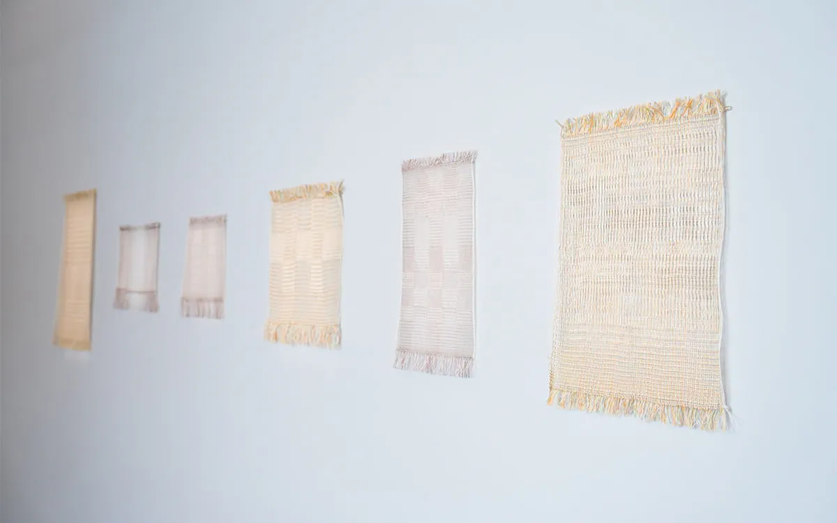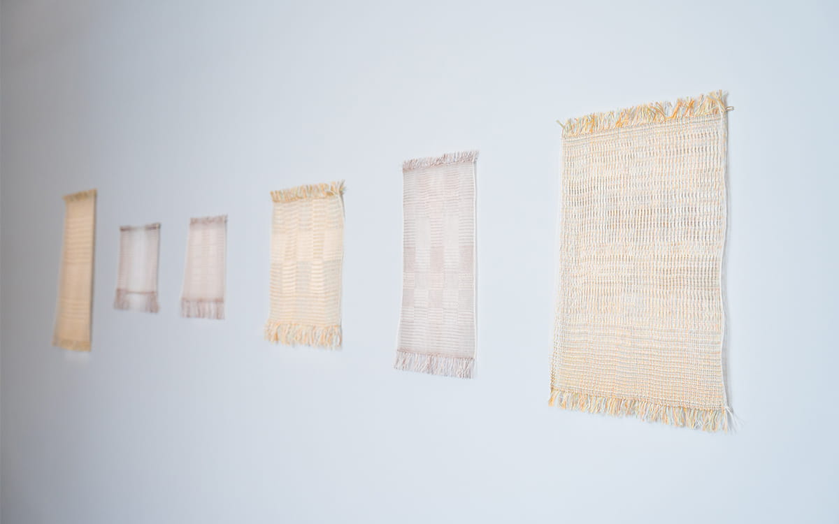 TL: Beyond the physical interlacing of yarn, I see weaving more broadly as the logic that holds these structures together. This logic has no definite form and can manifest in different ways; it can be planar, or three-dimensional, solid, or porous. Even though the weaving loom tends to produce planar surfaces, the resulting woven material can be skewed, stretched, twisted, and draped into new forms when occupying a space. While conceptualising ideas for this exhibition, I considered how the placement of each piece within the space might induce a quiet and contemplative experience for visitors to work around, step closer, and observe the shifting colours. It is important to me that visitors could observe the works from varying vantage points, and while moving, in order to catch changes in their own perceptions.