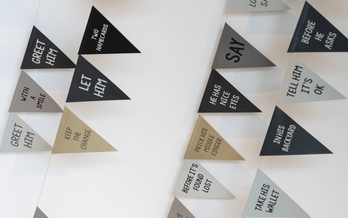 Friendly Strangers Party features pennant flags recounting personal encounters with people of unknown identity who left a lasting impact on me. In its first presentation in Osaka in 2019, the flags hung on curved lines, creating the illusion of an impending or abandoned party. In Onomichi later that year, I let the organisers hang the flags as they deemed fit, and they did so on 'broken' dangling strings, evoking a forlorn ambience which I enjoyed. In its current third iteration at Esplanade, the recessed wall provides a contained space, akin to a parallel world where flags fall like rain. The work remains adaptable to new contexts.