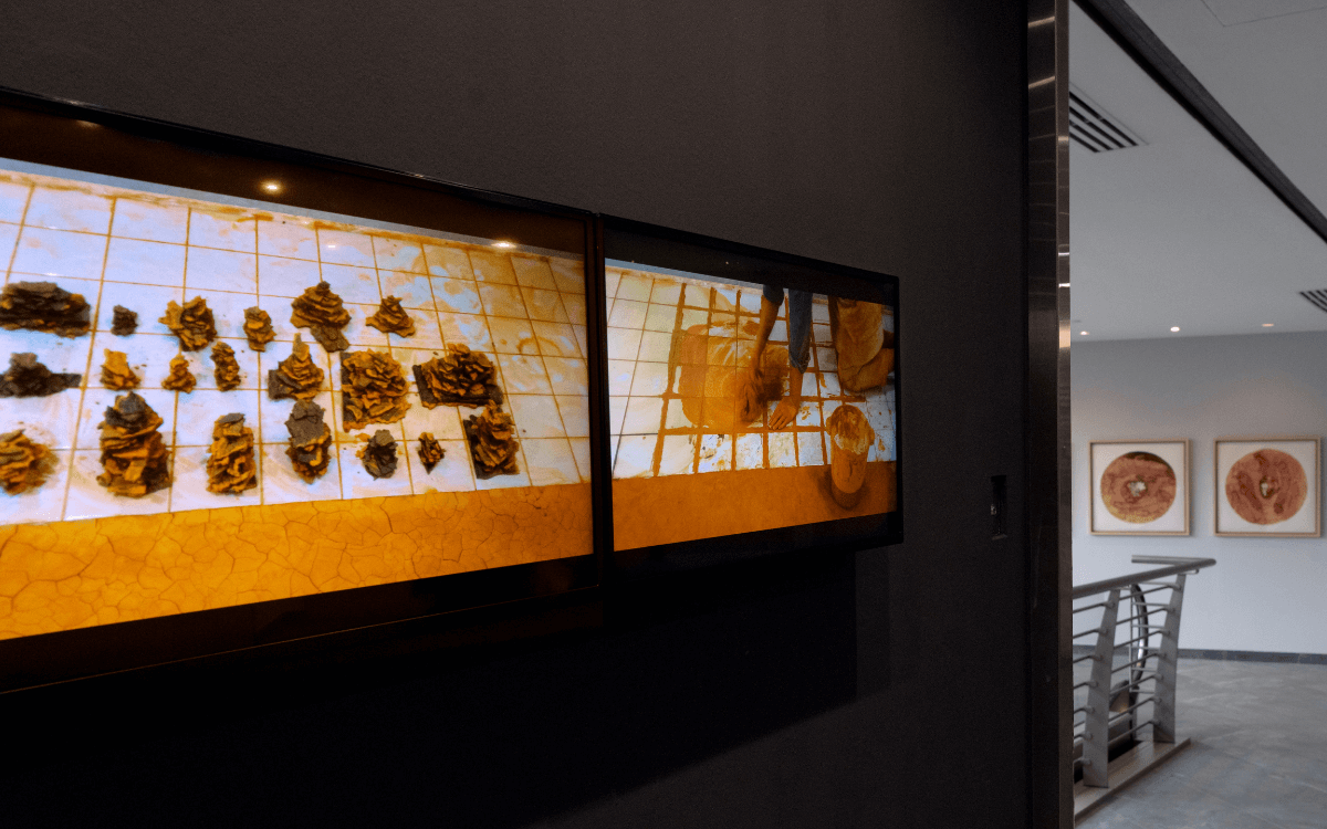 In Gathering Space《凝散》, Che seeks to understand time through clay’s material properties. Hand-pinched, unfired clay bowls are filled with coloured pigments brewed from Chinese medicinal herbs which inevitably seep through. The prints shown capture the erosion of these vessels by these vivid yet impermanent pigments.