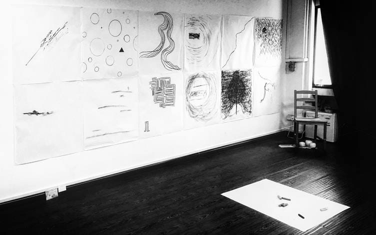 Charcoal sketches on the walls of the space that Emergency Stairs occupies.
