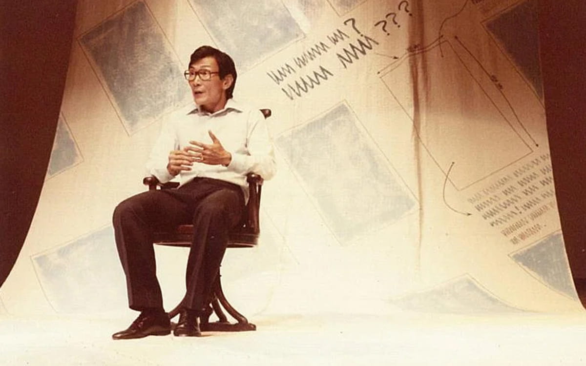Actor Lim Kay Tong plays the protagonist in the original English version of Kuo Pao Kun's <em>The Coffin Is Too Big For The Hole</em> in 1985. Image courtesy of The Theatre Practice.