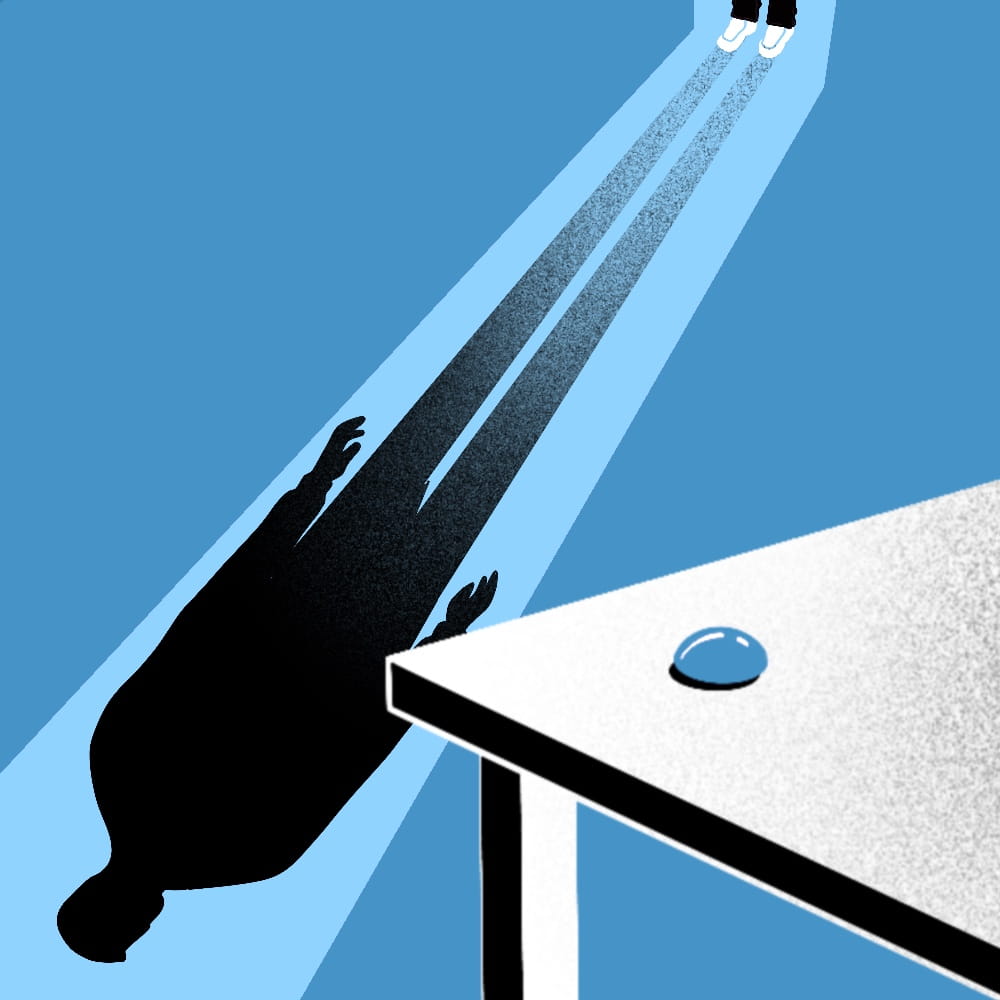 “桌旁的人”是自我的投射。读者看到的是“桌旁的人”醒觉的目光,他/她在蚂蚁身上见证了自己的人性面貌。当他以高姿态观看自我,并进行清醒的自我审视时,他无可避免地发现了人类状态的荒谬性。 整篇文章的笔触有点可笑,又有点悲哀。文末,作者阐述:“我们不知道蚂蚁在它的海边待了多久”,忽然又让视角从蚂蚁、水滴、桌面、桌旁的人,转移到读者身上—— 读者也意识到,自己通过“桌旁的人”,见到了自己在“海洋”前的姿态。阅读这篇文章,像是看进了棱镜:似乎见到许多形态、许多面貌,实则都是自己的脸。