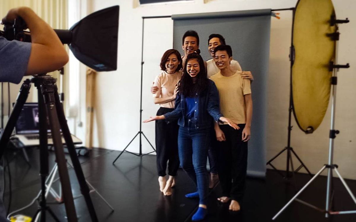Cherilyn (centre, in blue) in a photoshoot with the cast of <em>FAUST/US</em> (2019). Image credit: Nine Years Theatre.