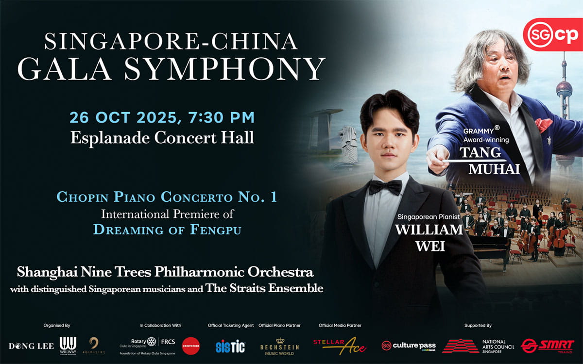 World-renowned conductor Tang Muhai returns to Singapore to lead the Shanghai Nine Trees Philharmonic Orchestra alongside distinguished Singaporean musicians, in a landmark program weaving together beloved Western and Eastern classics. Singaporean pianist William Wei, celebrated for his expressive touch and commanding stage presence, makes his homecoming debut with Chopin’s Piano Concerto No. 1, a youthful masterpiece radiant with poetry, beauty, and virtuosic brilliance.