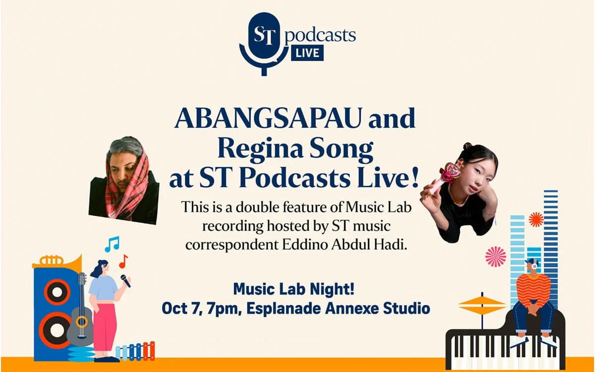 The fifth edition of ST Podcasts Live is a double feature of Music Lab recordings. Hear more from ABANGSAPAU and Regina Song!
