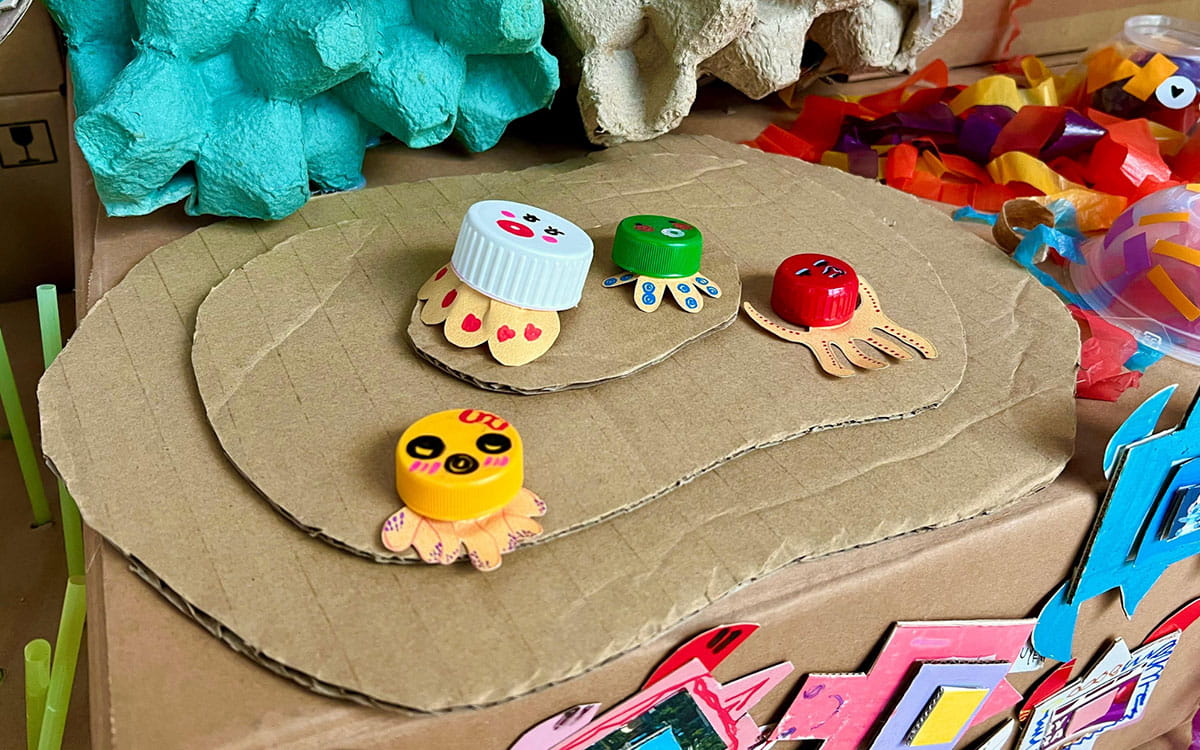 As an extension of this project, families visiting PIP’s PLAYbox are invited to craft their own mini octopuses. Using bottle caps and other simple materials provided onsite, children can make an octopus to take home or add to the installation.