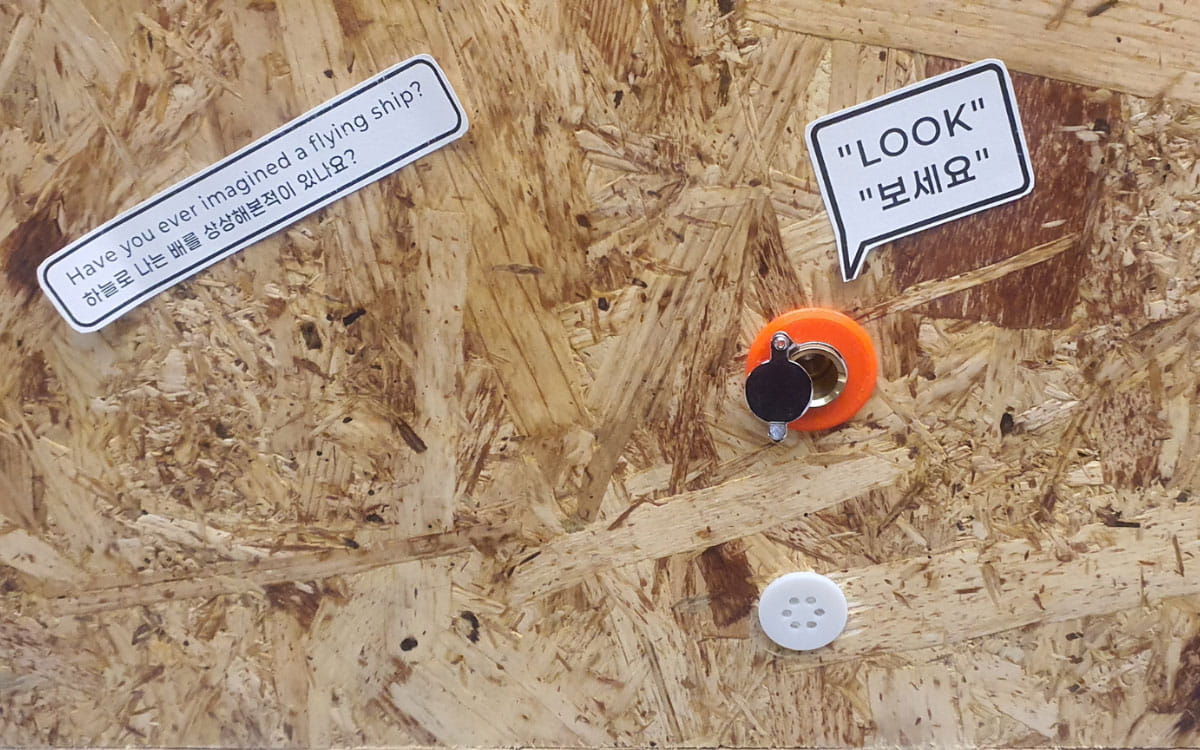 Inspired by the performance Voyage, this intimate object installation invites audiences to encounter a miniature world hidden inside a box-shaped peepshow. Peer through the box’s small viewing holes and watch a poetic landscape unfold—delicate paper boats drift through a vast blue sky, gliding between soft clouds as if sailing across both sea and horizon. The tiny world is brought to life through carefully layered sensory elements: the sound of wind and waves, a subtle ocean scent, shifting light that mimics the sun’s soft rays and the gentle motorised movement of the floating boats.