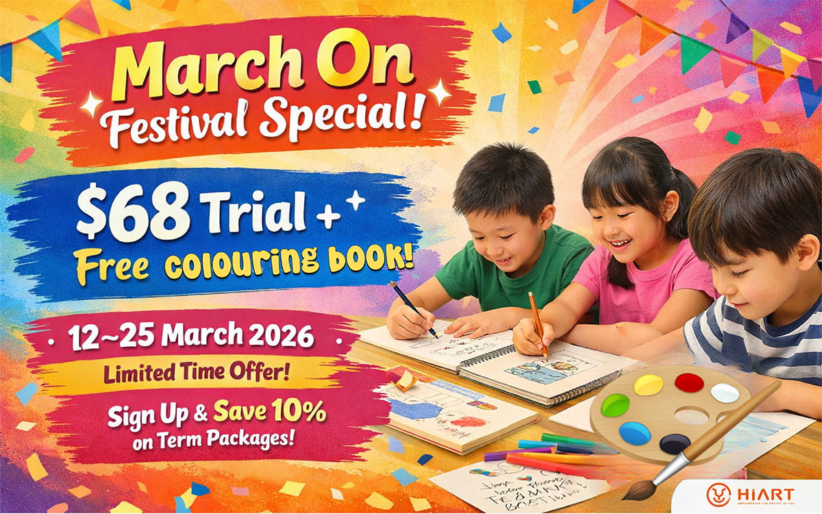 Unleash your child’s inner artist during March On! From 12 – 25 Mar 2026, go for a trial class at $68 (U.P. $90). On top of that, you’ll receive a complimentary colouring book, and get 10% off term packages when you sign up within seven days from the day you attend the trial.