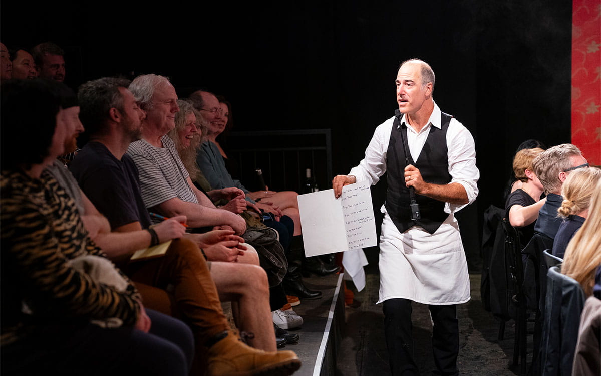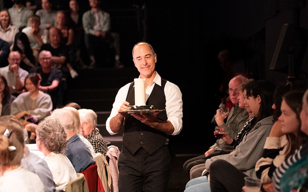 At the centre of the performance space lies a comically large banquet table, encircled by audience members. The host of the evening, Geoff Sobelle, conducts this multi-sensory experience with deft hands, animated expressions and impressive physicality. Activating the senses through a myriad of sounds, scents, sights and textures, this acclaimed theatremaker stitches together a conversation about personal memories, consumption and the evolution of food production over generations. You are invited to be a guest at the dinner party—whether around the table or from the surrounding seats.